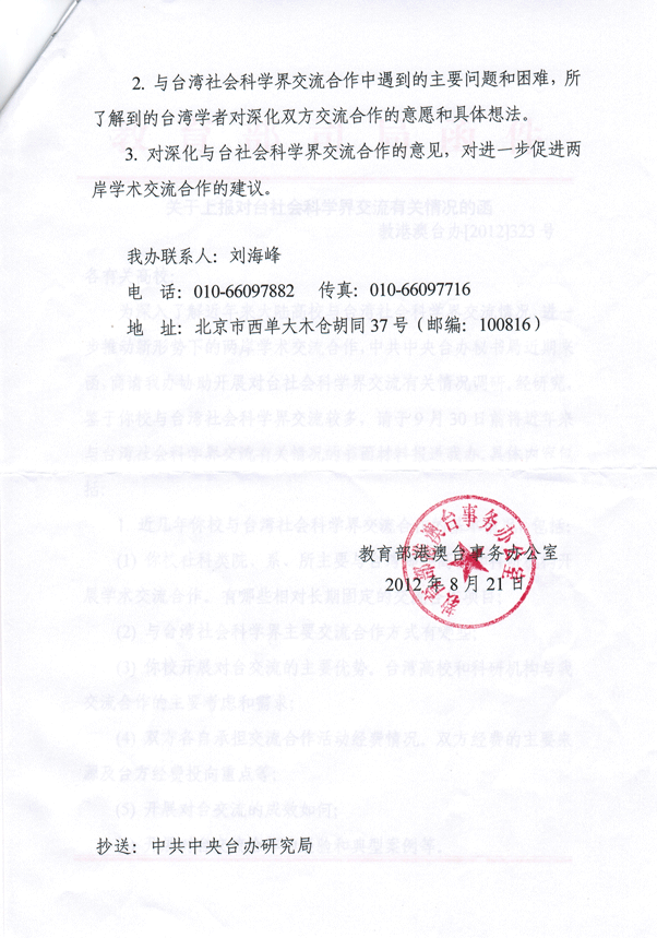 请参与和主持对台社科类学术交流活动的各位老师于9月20日之前发送相关材料,由外事秘书汇总后上报学校港澳台办公室。