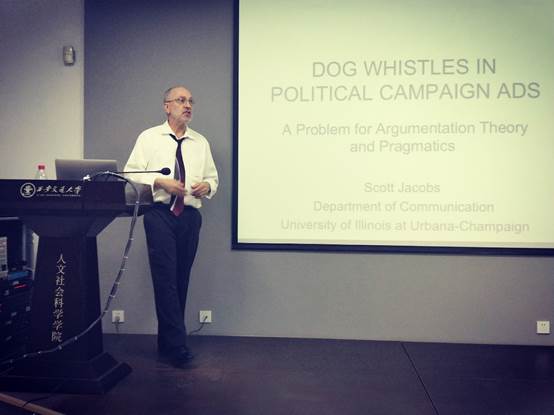 在《美国公共论辩中常见的语言陷阱》报告中,Jacobs教授向大家展示了广泛存在于美国商业、政治等公共活动中的一些较为常见的隐性欺骗性言语伎俩;借助于商业广告、竞选活动、政治辩论以及其他说服性活动中的大量案例,Jacobs教授着重阐述了他对著名语言哲学家H. P. Grice和S. C. Levinson的一些相关语用原则的有效运用及重要发展。