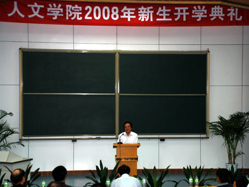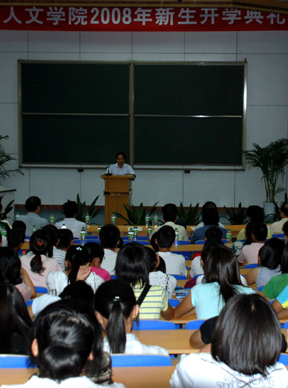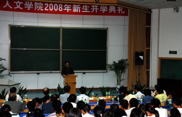 丘进副校长首先在开学典礼上作了讲话。丘校长用亲切的语言向08级新生介绍了西安的生活情况,给来自全国各地的新同学送去了深切的关怀和祝福。他还介绍了西安交大的光辉校史,并以人文科学优秀校友的事迹激励新生为人生新的里程不断奋斗、不断创新。王宏波院长代表全院向新生致欢迎词,并从文科生的综合素质和学习态度等方面对新生提出了要求,王院长还衷心的送出四句话和同学们共勉:志存高远,脚踏实地,自强不息,放飞理想。接着,副院长李建群教授向同学们详细的介绍了学院本科专业设置和学习要求。