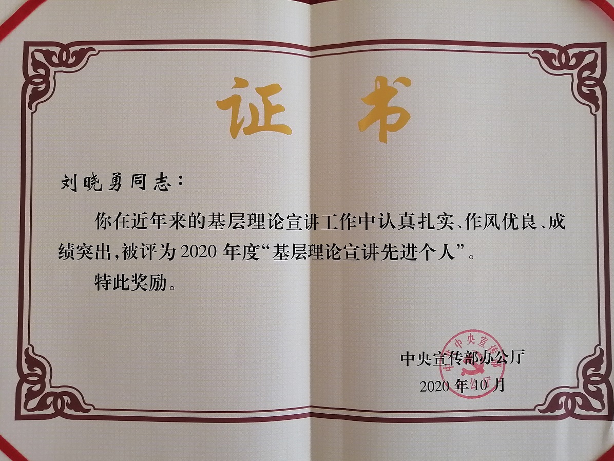 党的各级理论讲师团是党的创新理论宣讲工作的重要力量, 基层理论宣讲是党的理论武装工作的重要组成部分。中央宣传部每年都要集中表彰一批基层理论宣讲先进集体和个人。经过基层竞赛选拔和层层推荐,刘晓勇作为我省唯一理论宣讲工作者获得“全国基层理论宣讲先进个人”荣誉称号。