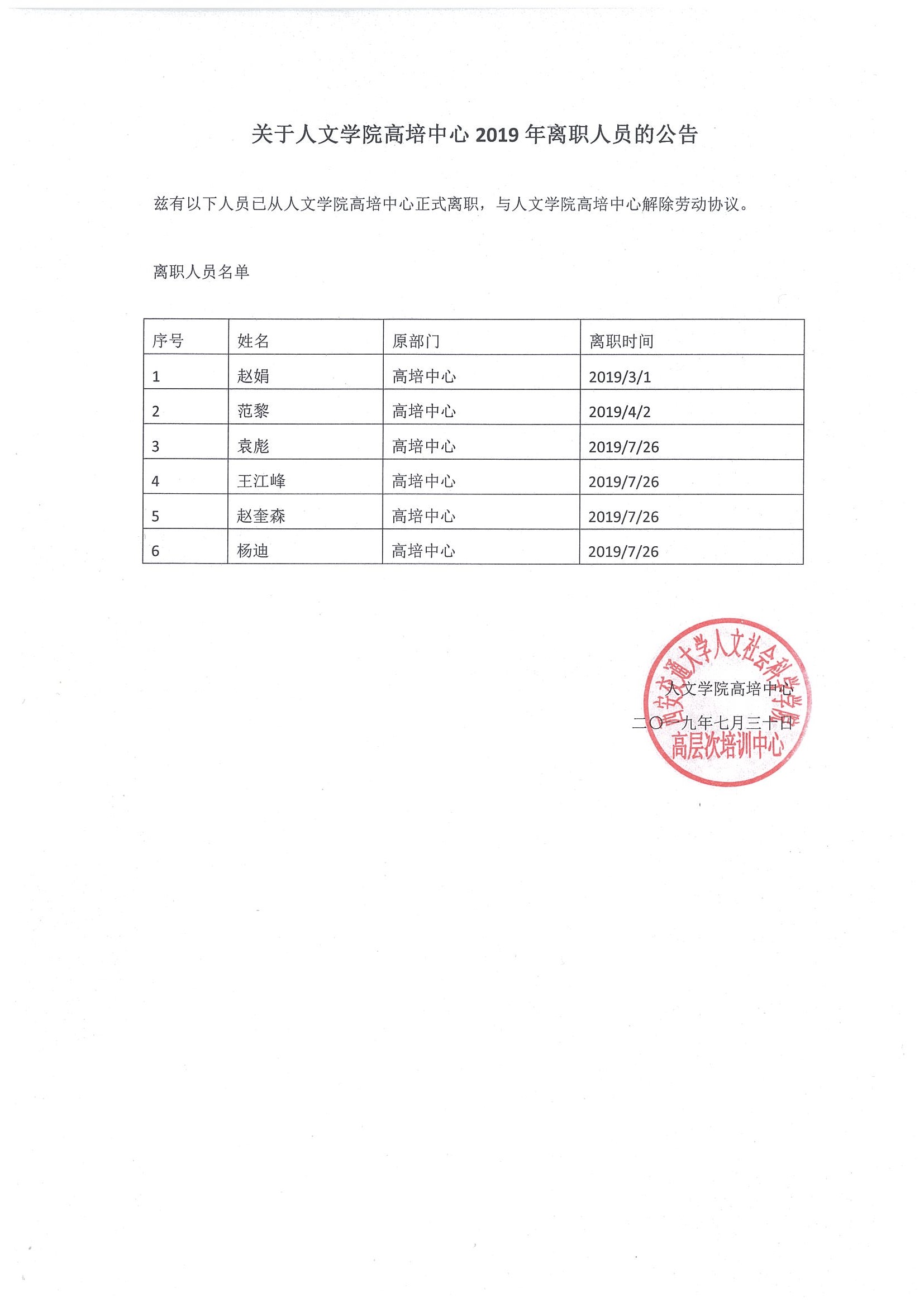 2019年高培中心离职人员公告