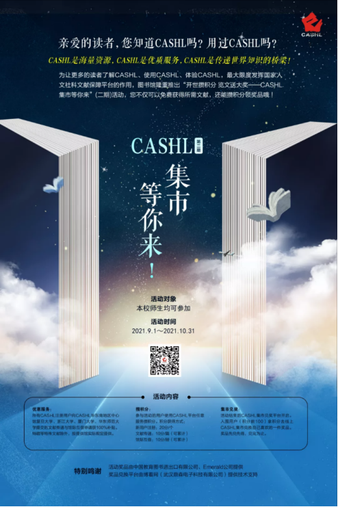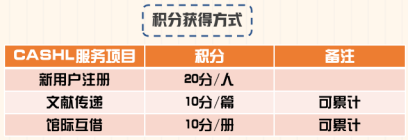 本校师生通过 //www.cashl.edu.cn 开世览文平台提交文献传递或馆际互借服务申请,均可攒积分。积分前100的用户获得兑换奖品的资格。