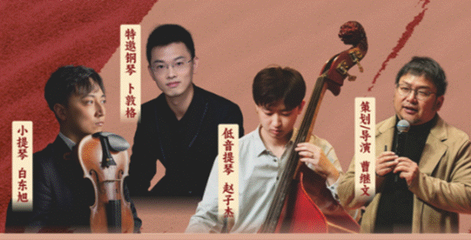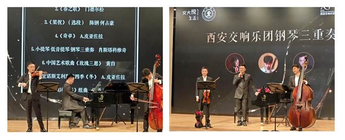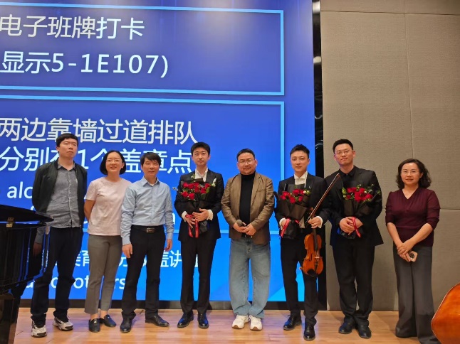 本次论坛邀请了西安交响乐团的曹继文总监以及XSO西安交响乐团室内乐组的三位青年音乐家白东旭(小提琴)、赵子杰(低音提琴)和卜敦格(钢琴)。张勇副院长首先对于曹继文总监和三位音乐家的莅临表示欢迎和感谢。张院长介绍到曹继文总监是西交大的老朋友,去年曹老师就曾做客过我们的美育高端论坛,并且还带领艺术家来创新港进行过专场演出。感谢曹老师和西安交响乐团一直以来对交大美育工作的鼎力支持。本次论坛曹老师和三位音乐家要给我们带来的是钢琴三重奏专场音乐会。在交大的129年校庆之际开办这场音乐会也有着特别的意义,这次音乐会也是给交大129年校庆的特别献礼。