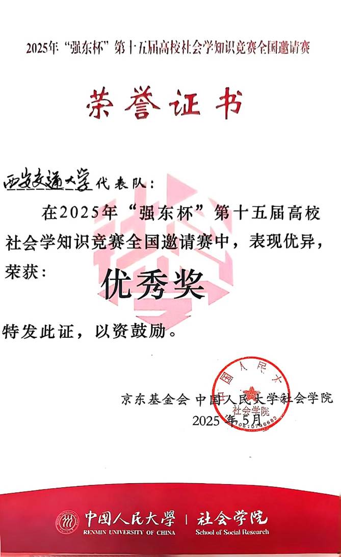 代表队荣获优秀奖。此外,在5月18日举行的“强东杯”第三届社会学类本科生学术论坛中,社会学系税宇航、高珊、石尚、谭慧玲、张曦源、周优的论文受邀在“人口、家庭与社会”分论坛发言交流。