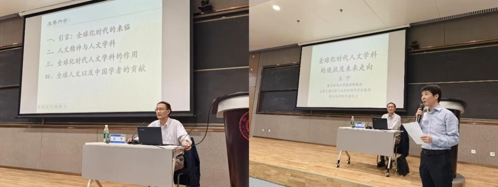 王宁教授在讲座中表示,全球化包括经济、金融、文化建构、理论话语等多个方面。全球化并不只是经济问题,同时也是文化问题。他认为,“全球人文”具有两重含义,第一是人文精神,第二是人文学科。人文学者关注人的精神生存环境,当环境受到外部影响时可以快速意识到。人文学者热爱读书,知识面往往广阔,能够敏锐察觉到当下所关注的前沿理论话题并作出反应。人文学者擅长使用文字表达思想,文字语言也更容易打动广大读者。他认为,任何一所世界著名大学都会注重人文学科的作用,组织具有人文价值的活动,活跃校园气氛。人文学科在大学学科分布中,占据着不可或缺的席位,只有人文学科发展好,才能称得上是一所综合性大学。人文学科在现代社会的作用,首先其在现代大学体系内是不可缺少的一部分。人文学科可以在大学校园中营造良好的学术环境。大学里的人文学科可以服务社会,向社会提供先进的思想和价值观念。