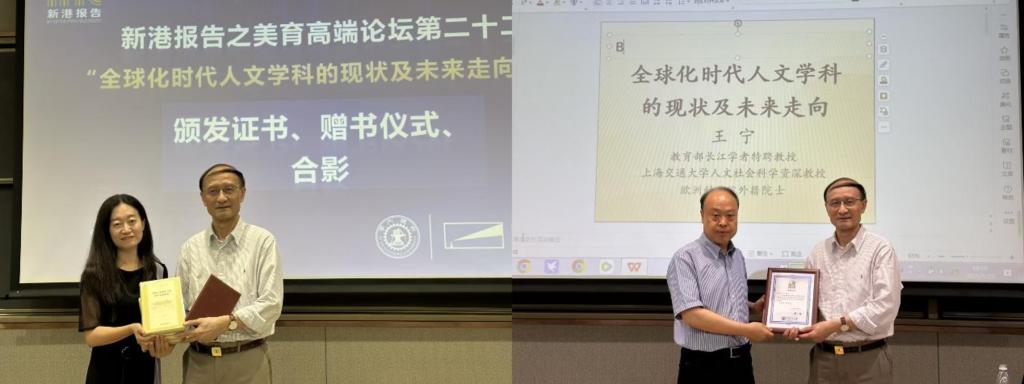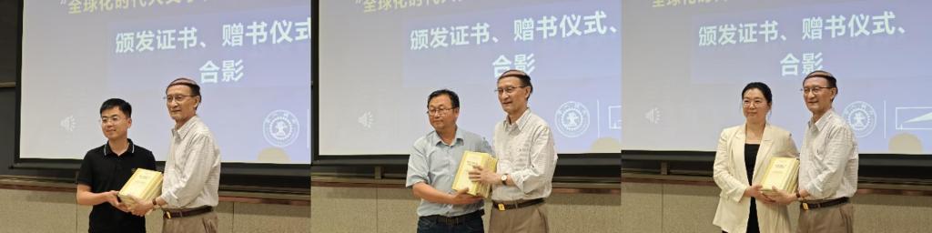 论坛最后,李黎明为嘉宾颁发荣誉证书并合影留念。王宁教授将100本专著《全球人文视野下的中外文论研究》赠送给师生。