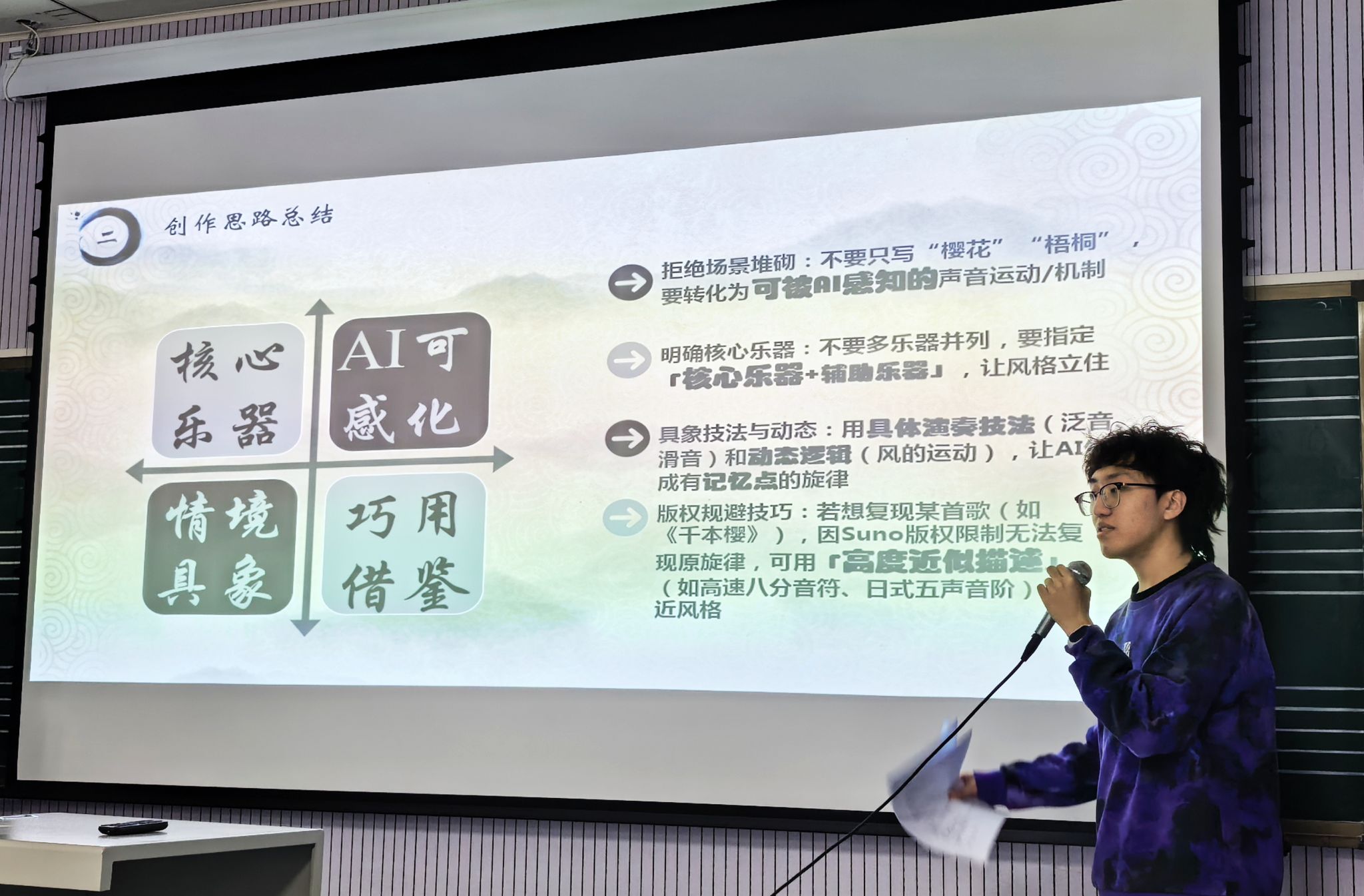 此次活动的核心亮点的是将“AI音乐生成技术”与“中国风”音乐深度融合,打破传统音乐创作的边界,让同学们在传承古典文脉的同时,借助科技手段表达对母校的深情。课堂上,各小组依次展示原创作品,每一首旋律都承载着对仙交的独特感悟与祝福。