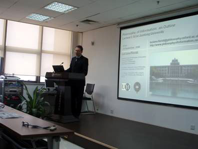 根据中国社会科学院与英国学术院(British Academy)的协议,英国著名学者,当代国际信息哲学(Philosophy of Information)的积极倡导者和创始人弗洛里迪(Luciano Floridi)教授,应邀于2008年9月21日至30日在中国进行了访问,共做了五场系列学术讲演。其中在北京进行了四场,分别在中国社科院、北京大学、中国人民大学、北京理工大学。应我校成人影视片
