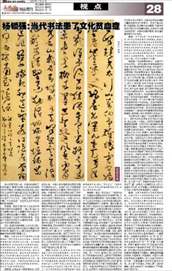 《西安晚报》“水墨中国”对话我院中国书法系副教授杨锁强,7月4日发表了题为“杨锁强:当代书法患了文化贫血症”的访谈。以文化的立场对当代中国书法发展中的部分问题进行了剖析与反思,指出当代书法患了文化贫血症。《美术报》于7月25日全文转载了该访谈。并配有现中国书法家协会副主席邵秉仁的作品。