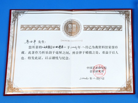 我校马西平老师所著的《西安鼓乐古曲谱集》作为典籍藏本于2009年8月16日被中国艺术研究院音乐研究所资料馆荣誉珍藏并颁发证书。
