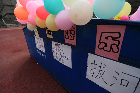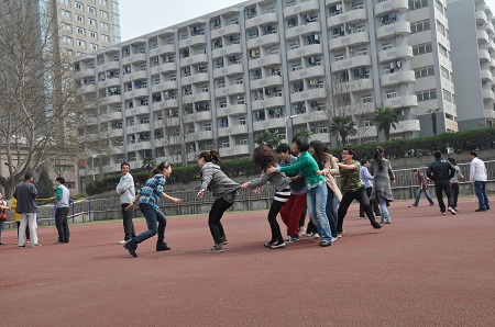 整个活动现场共分为三大区域,“80后回忆馆”、“80后照相馆”和“80后游乐园”。五彩气球装点下的“80后回忆馆”向大家展示了童年时期那色彩斑斓的稚趣和回忆:小巧灵动的绿皮蛙;五颜六色的粘牙糖;排排整齐的泡泡胶;超萌可爱的套水圈……不时引来同学们竞相参观和声声惊叹。“80后照相馆”则盛大开业,为今天前来参加游戏的同学们拍起了照片。最为热闹的当属“80后游乐园”,同学们热情似火地玩起了童年的游戏,一时操场弥漫着童年的温馨,化为了笑声的海洋。跳大绳游戏一开始,同学们个个神气十足,速度和动作不减当年风采,顿时场外一片欢呼和祝贺声;在接力跑游戏中,同学们自行组队,个个摩拳擦掌,队员们手握“火腿肠接力棒”,似离弦的箭跑得飞快,在相互配合和传递中,荡漾起童年的欢乐;“摸妃子”更是将现场气氛推向了高潮,“皇帝”身手矫健,“张牙舞爪”地摸着“妃子”,不时有人难逃“魔抓”终究落网,场外的观众爆发出雷鸣般的笑声,不禁拍手叫好……除此之外,同学们“一拥而上”,更是以抽奖的方式赢得了诸多大奖,吃着久违的泡泡糖,玩着超萌的套水圈,感受到的全是童年的味道。整个活动最终在快乐、温馨的氛围中圆满结束。