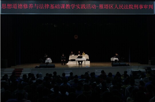 2014年12月12日下午,为了配合《思想道德修养与法律基础课》教学实践活动,思想政治教育研究所邀请西安市雁塔区人民法院刑事审判庭在宪梓堂开庭审理一起刑事案件。在这起案件中,犯罪嫌疑人吴某伙同他人预谋并于深夜抢劫在校大学生王某的现金、手机等财物,并对被害人进行了殴打和威胁。