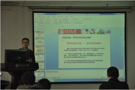 史田野老师首先对研究生的学位论文质量与规范问题做了汇报,分别从国家层面、学校层面对研究生论文的写作规范、科学道德与学风建设做了详细的说明,提出“坚持学术诚信,杜绝学术不端”的口号,对在座研究生起到督促和警示的作用。