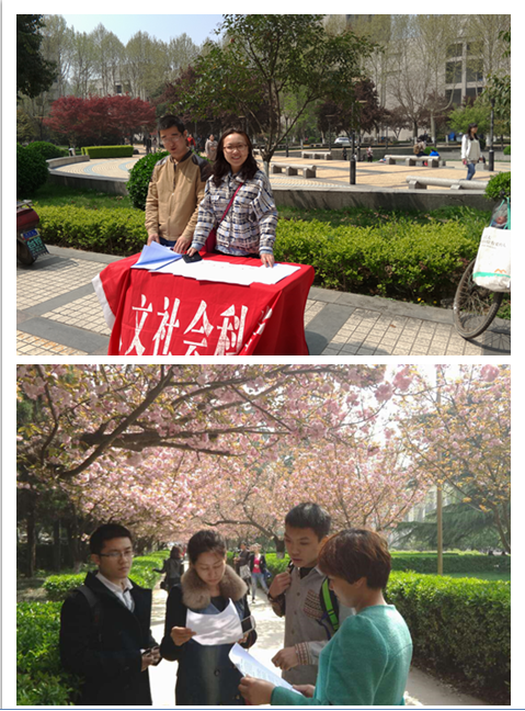 同学们分别在康桥苑和梧桐苑门前积极宣传。以校庆为契机,向交大学子和来校参观的市民介绍交大深厚的历史文化底蕴和富有教育意义的校训。“精勤求学,敦笃励志,果毅力行,忠恕任事”及其从南洋公学《四勉歌》中传承而来的发展历程。