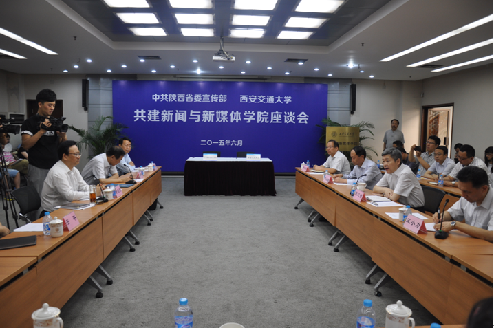 共建“新闻与新媒体学院”座谈会在交大兴庆校区科学馆207召开。陕西省委常委、省委宣传部部长景俊海,陕西省人大常委会副主任、西安交大党委书记张迈曾,中共省委宣传部副部长、陕西省记协主席薛保勤,交大党委副书记、纪委书记赵昌昌、党委副书记宫辉等校领导出席座谈会。座谈活动由校党委常务副书记王小力主持。