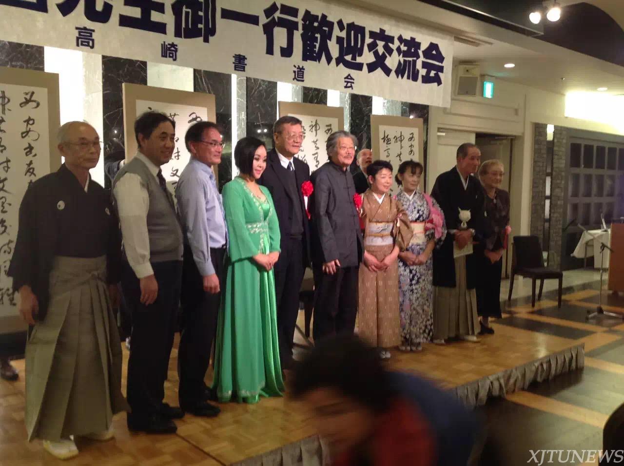 在欢迎晚宴上,日本吟诵艺术家德江岳游、尺八表演艺术家米谷茂之先生以日本传统方式吟唱了高崎书道会会长天田研石先生为钟明善先生一行所做的汉诗《书道吟》:“西安书友喜寻来,于老精神共有财。文墨交流风雅极,高楼一夜盛筵开。”在吟诵的同时,四位书家现场书写了此诗。陕西省于右任书法学会名誉会长王改民先生也依韵奉和七绝一首:“钟郎跨海今又来,于翁精神壮其怀。书艺交流多盛事,中日文化源流开。”