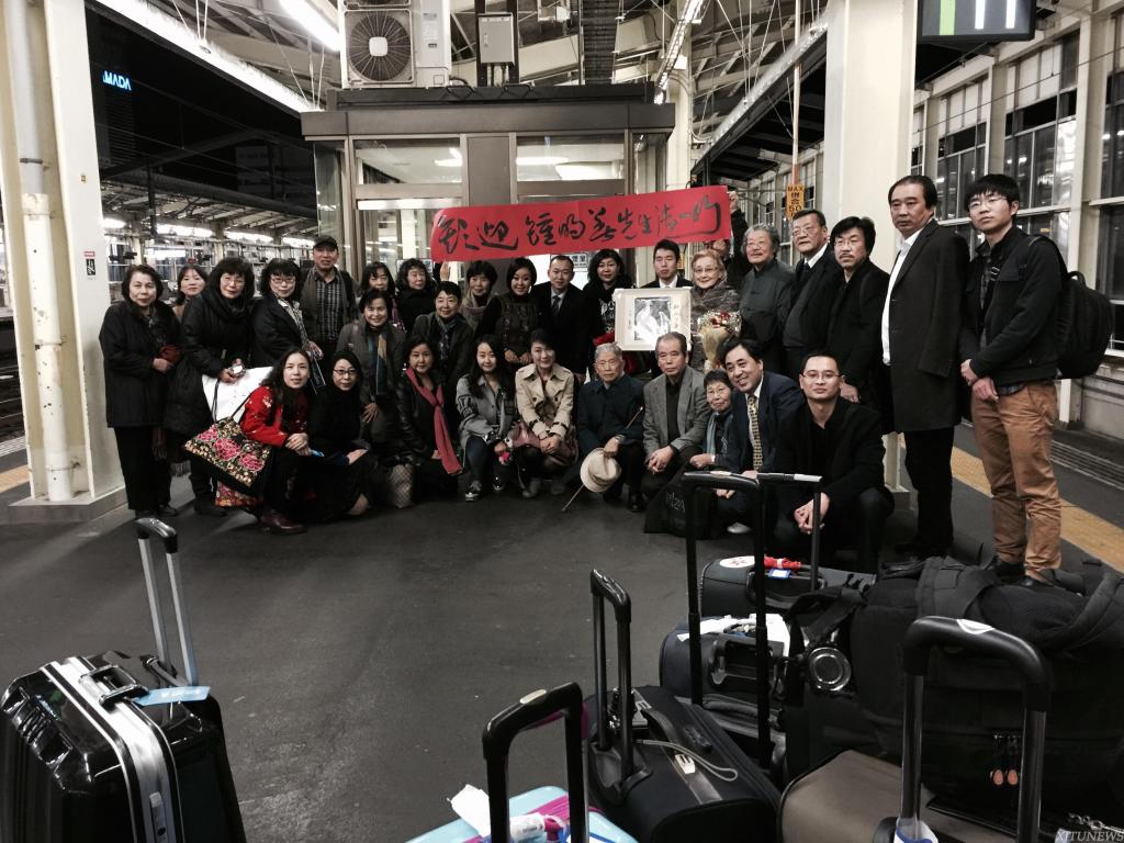 钟明善教授一行到达高崎时,80多岁高龄的天田研石会长、小林幽斋副会长亲率高崎书道会十余同仁专程前来站台迎接。尤其在走下火车的一瞬间,看到金泽子卿先生遗孀、80多岁高龄的金泽清华老夫人与儿子、孙子怀捧先生遗照,在站台恭迎的情景,很多人都留下了感动的泪水。