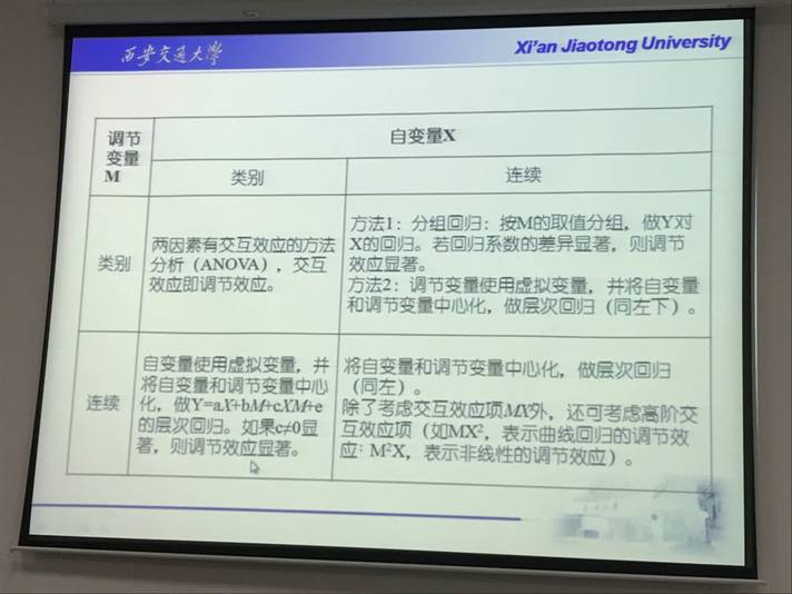 刘老师还和大家分享了中介效应检验的三种方法以及在这过程中Sobel检验的运用,并从研究目的、关联概念、考虑条件、模型中的位置、M的功能、M与X和Y的关系、效应、效应检验等八个维度系统比较了调节变量和中介变量的差异。为增进大家对理论的吸收,刘老师还结合数据案例通过Stata软件具体演示了检验调节效应和中介效应分析的程序。与会师生还就数据去中心化处理的必要性、如何设计调节效应模型和中介效应模型、多重共线性的处理、主效应不显著但交互效应显著的情况下调节效应是否存在等问题与刘老师进行了深入交流。