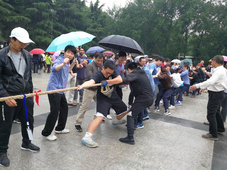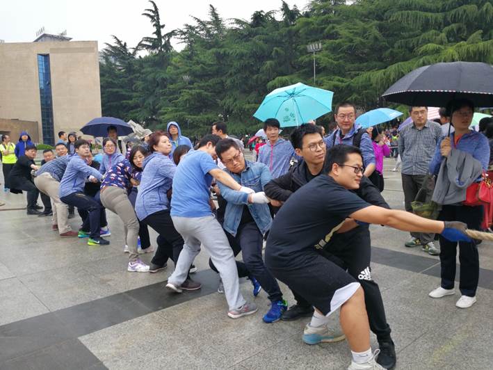 的教职工们不畏风雨,不顾地面湿滑可能受伤的风险,劲儿往一处使,在“一、二、一、二”的加油声中,互相鼓励,取得了运动会教工拔河第七名的历史最佳成绩。