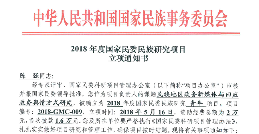 近日,国家民族事务委员会公布了“2018年度国家民委民族研究项目评审结果”,传播学系青年教师陈强副教授申请的研究课题“民族地区政务新媒体与回应政务舆情方式研究”获得青年项目立项(项目编号:2018GMC-009)。