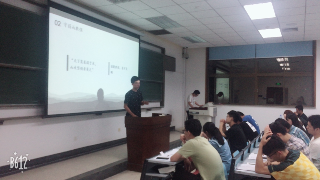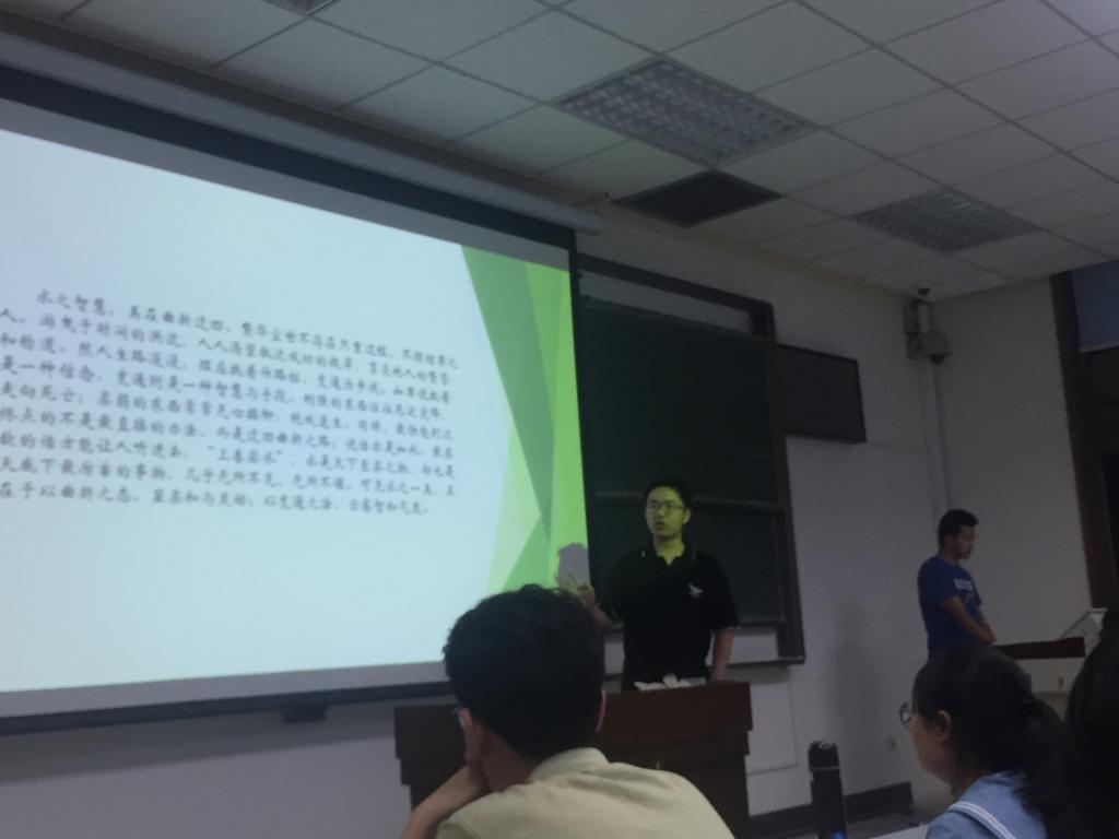 同学们以小组为单位,围绕所学内容自行选定主题进行汇报展示,有的小组探究《道德经》思想在企业管理中的应用,有的小组对水的品质进行了分析,有的小组梳理了金庸小说中道家思想的体现,有的小组谈了他们对老子“无为”思想的看法……展示的同学颇有挥斥方遒的书生意气,讲台下的同学在他们充满感染力的演讲中也津津有味,可以看出翻转课堂取得了不错的效果,而同学们的积极参与以及展示的质量也预示着翻转课堂的确是教学改革的方向。