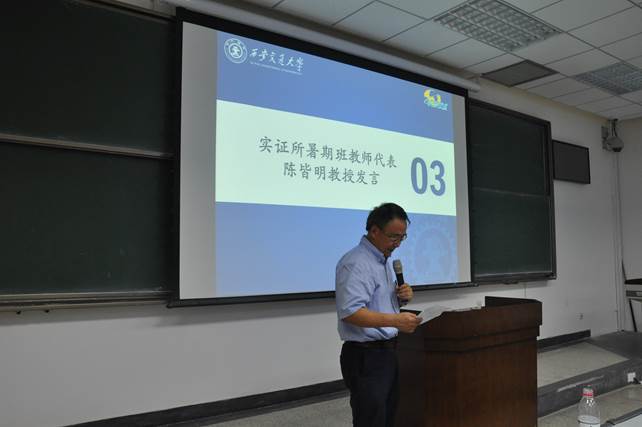 来自德克萨斯农工大学的社会学教授陈皆明先生代表教员致辞。他讲到“科学的目的是求真,自然科学是如此,社会科学也在向这一方向努力。“工欲善其事,必先利其器”,暑期班的所有课程,其目的就是为大家介绍社会科学研究中的各种工具。但学习工具固然重要,却不能忘记学习的初心。不忘初心,才能有效的利用研究工具,更好的了解纷繁复杂世界。除此之外,作为交大老校友,陈老师还向学员介绍了西安的人文历史,嘱咐大家学习之余勿忘“吃碗羊肉泡馍”。
