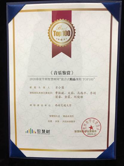 《音乐鉴赏》MOOC自2018年3月起在智慧树和爱课程平台相继播出,止2019年12月全国累计学习学生约有17.5万人。2019年12月被智慧树网评选为“2020春夏学期混合式精品课程TOP 100”。