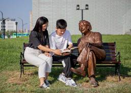 如果说董琪和石淑婕是二维平面的设计师,那么欧阳振宇则是三维空间的雕刻家。2020年8月1日,“与大师对话”系列首件作品——爱因斯坦雕塑在创新港落成。在一把长椅上,爱因斯坦坐在一端,另一端则是留给观赏者的空位,极具留白的分寸感。这只是欧阳振宇“与大师对话”系列的序幕,牛顿雕塑、李约瑟之问、钱学森之问等作品也将陆续展出。除了“与大师对话”系列之外,“契机不是少数人的专利”同样作为创新港十大“网红打卡地”,激励着每一位在此驻足的有志之士。