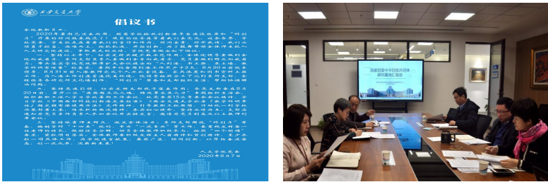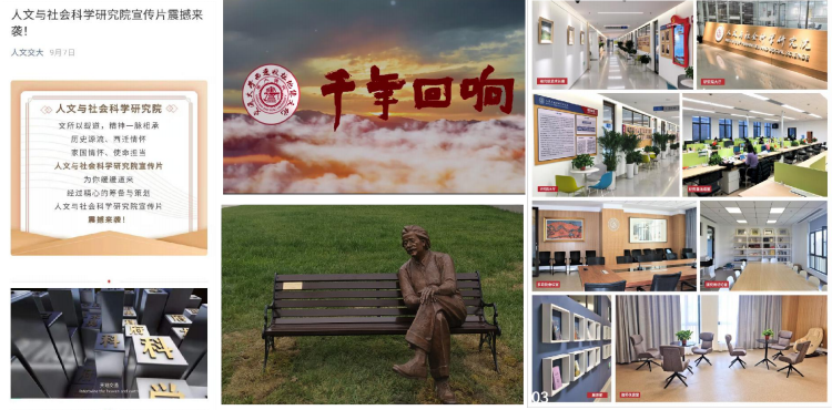 人文精神建设的重要“窗口单位”,始终将人文精神和文化建设作为塑造“人文旗帜”的重要抓手。2020年,学院党委高扬以爱国主义为核心的“四面旗帜”,将西迁精神作为入职、入学第一课。组织师生学习抗疫先进事迹,参与科研攻关,开展心理援助,创作文艺作品。推进“三全育人”综合改革,丰富师德教育载体,与新进教师谈心谈话、组织青年教师座谈会,了解青年教师思想和工作动态,加强思想引导和业务帮扶。动员教师积极“跑5”,对接需求、了解国情、拓展视野、精准服务。树立“嗷嗷叫的”青年群体,宣传先进事迹,引导教师在平凡岗位创造不平凡业绩。加强研究生思政工作,将导师育人责任分解落实在学业指导、思想引导、就业帮扶等环节;组织学生参加学科、学术竞赛,举办“樱花杯”诗词大赛等活动,激发学生创新活力。获批“文化+”平台建设项目,鼓励教师参与设计、创作创新港Logo、楼牌、铭石、雕像、景观园林等文化标识、纪录片《千年回响》、原创文艺作品。完成创新港研究院文化长廊建设,拍摄、制作学院中英文宣传片、宣传册,“人文交大”微信公众号累计阅读量14万+。获评学校首届精神文明建设先进单位。