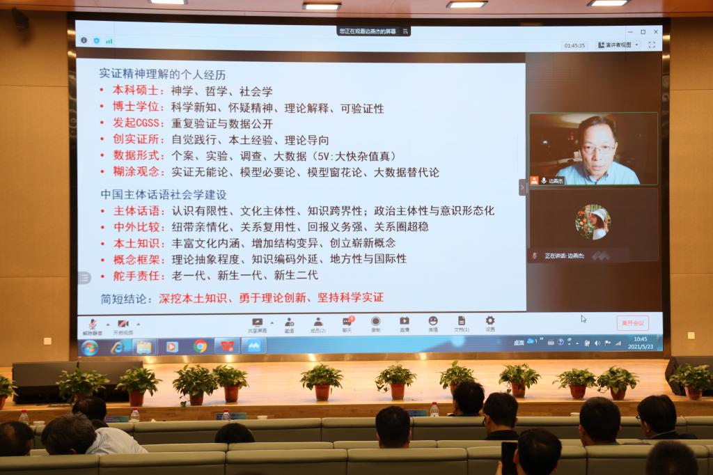 教授边燕杰通过线上方式作题为“科学实证精神与中国主体话语社会学建设”的主题报告。他提出,要深挖本土知识,勇于理论创新,坚持科学实证。边燕杰认为,中国学者做理论研究必须要研究中国现实问题,中国特色社会学的研究从哲学角度来讲应直接成为中国主体性研究,在提出中国主体话语时,应基于人认识的有限性,利用本土知识去进行概念建构,并且让知识理论跨界,坚持地方性和国际性的结合。