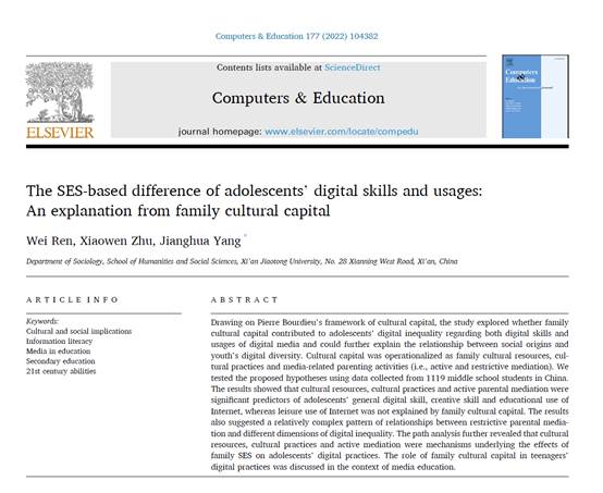 社会学系/实证社会科学研究所博士生任围、朱晓文教授与杨江华副教授共同合作完成的研究论文“The SES-based difference of adolescents’ digital skills and usages: An explanation from family cultural capital”在线发表,文章于2021年11月16日发表于ELSEVER(爱思唯尔)出版社旗下的SSCI期刊Computers & Education(计算机与教育)第177期上。该期刊2020年影响因子高达8.5,在教育学类264本SSCI期刊中排名第三,是教育学领域的国际顶级期刊。