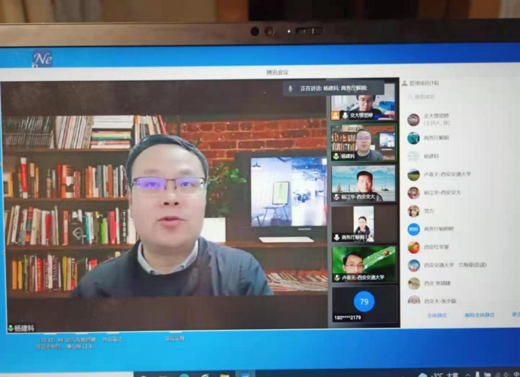 会议伊始,解娟处长简要介绍了课题前期准备情况。课题组负责人杨建科老师首先对商务厅的大力支持与信任表达了感谢,在介绍交大实证社会科学研究所相关情况之后,重点陈述了“2021年陕西服务贸易发展报告”编写思路。课题组代表鄂翌婷博士生从服务贸易数据描述、数据预测、政策文件梳理等方面详细汇报了课题前期工作进展。随后,商务厅贸易救济处各相关负责人分别就“数据的来源和指标体系构建”“数字服务贸易”“创新案例选择”“陕西服务贸易的发展规划、行业差异”“如何巩固陕西服务贸易优势、破解短板”,以及“建立陕西服务贸易的地方统计体系”等问题提出了建议和需求,课题组卢春天、杨江华、贺力几位老师也对上述问题进行了讨论和回应。最后,解娟处长对上午的会议进行了总结,并对课题的下一步开展提出了建议和要求。
