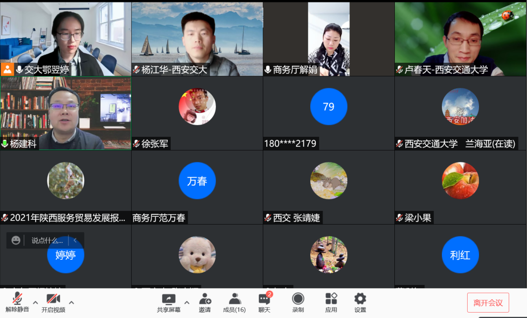 12月27日上午9时许,由我院杨建科教授负责的陕西省商务厅“2021年陕西服贸易发展报告”研究课题启动会在线上正式举行。会议由商务厅贸易救济调查处解娟处长主持,商务厅副厅长范万春,贸易救济处全体成员出席会议,课题组杨建科、卢春天、杨江华、贺力老师,以及相关研究生共同参与讨论。