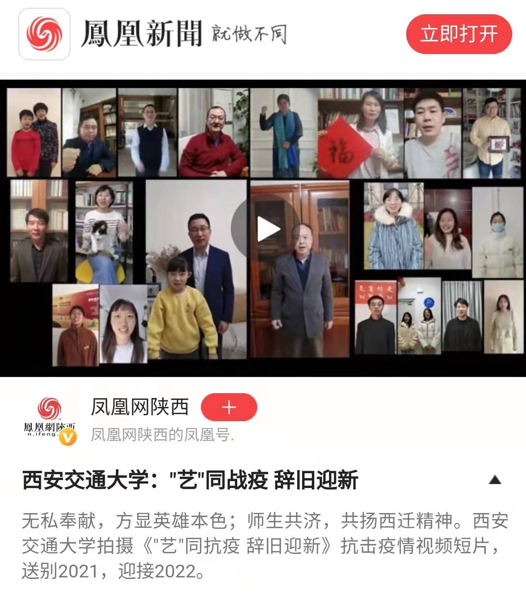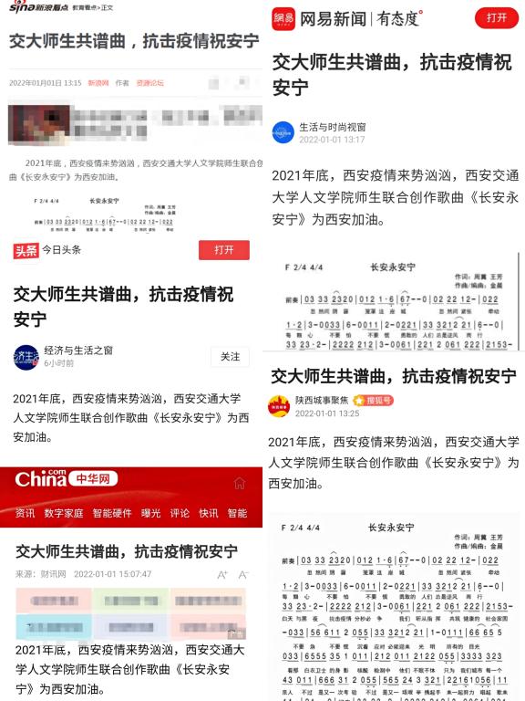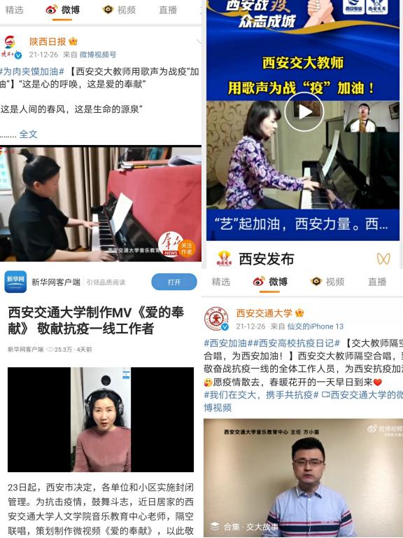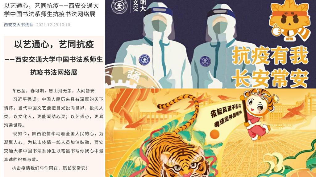 作为承担学校文化建设重点任务的单位,以文艺创作为抗疫加油是重大的政治责任。音乐教育中心教师联合校内师生隔空创作表演歌组曲:《爱的奉献》《长安永安宁》《光·明》,用歌声表达了对抗疫一线工作人员的敬意,对全市人民齐心抗疫的心声,和对这座千年古城的祝福,作品在各大网络平台发布后点击量快速突破30多万次。中国书法系举办“以艺通心,艺同抗疫”书法作品网络展,引导师生创作书法作品,以文化人,以艺通心,助力抗疫。艺术系教师通过引导学生创作海报、抗疫头像、日常空间再设计等方式,配合学校做好疫情期间的宣传与设计工作,传递抗疫暖心正能量。社会心理学研究所王瑜萍副教授撰写抗击疫情科普小贴士,引导师生服务大局,科学防疫。成人影视片