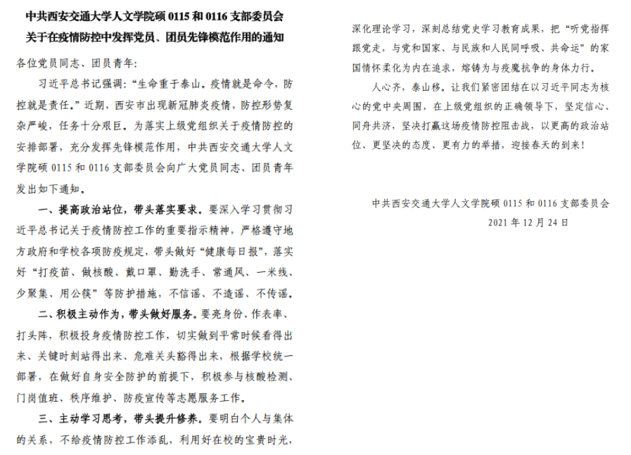 硕0115和0116支部委员会关于在疫情防控中发挥党员、团员先锋模范作用的通知》,强化人文关怀,鼓励成员响应学校号召,在疫情防控一线亮身份、树旗帜、担使命、守初心。