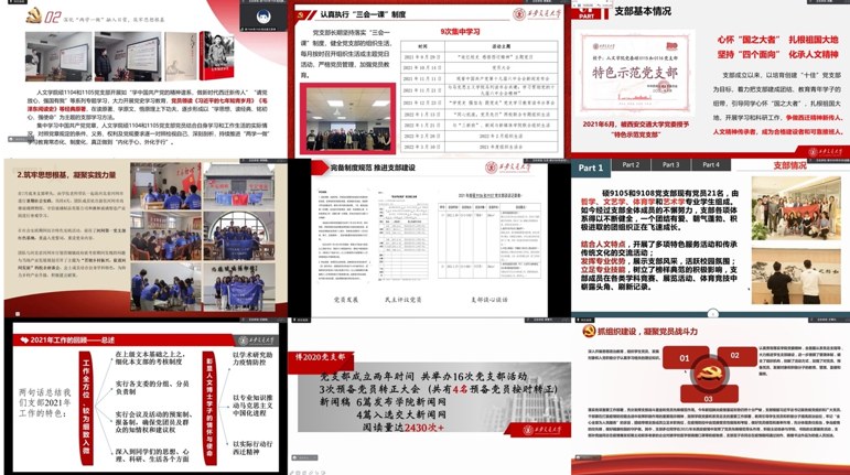 硕1104和1105党支部书记王彦清介绍了支部在2021年进行的各项党团活动,对支部存在的诸如与群众联系不够紧密等不足进行了反思,并对后续将实施的工作进行规划。硕1103和1106党支部开展了丰富多彩的支部活动,该支部发扬了同学们的学科专业优势,将理论学习与艺术活动相结合。疫情期间,支部党员积极投入到志愿服务活动中,并响应成人影视片
