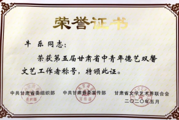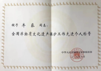 基于在非物质文化遗产研究保护领域突出的工作成绩,牛乐教授于2018年被文化和旅游部授予“全国非物质文化遗产保护先进个人”称号。于2020年被中共甘肃省委组织部、中共甘肃省委宣传部、甘肃省文学艺术界联合会授予“甘肃省第五届甘肃省中青年德艺双馨文艺工作者”称号。