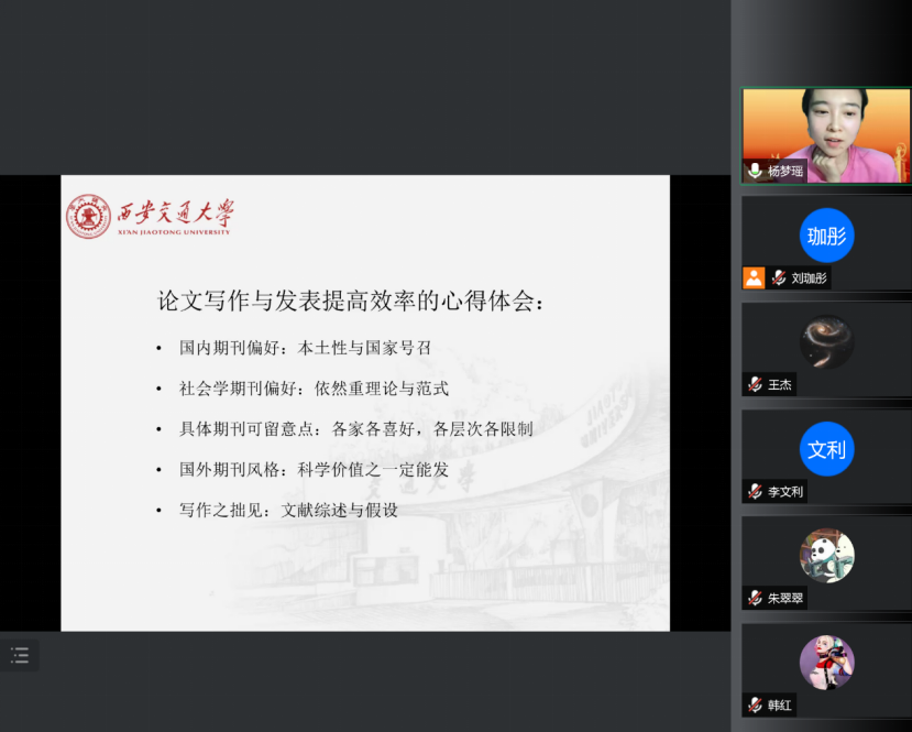 杨梦瑶博士的分享交流涉及研究选题、论文写作、理论范式、本土创新、职业规划以及求职经验等方面。她建议大家聚焦前沿问题的同时,更要重视对基础理论与研究范式的学习与理解;寻找创新的研究视角时特别要立足于国家发展现状,突出本土特色;在求职过程中要充分领会用人单位对专业的要求,分析专业发展趋势,认真规划职业发展方向。杨梦瑶博士勉励大家勿忘初心,做社会主义核心价值观的坚定信仰者、积极传播者和模范践行者。