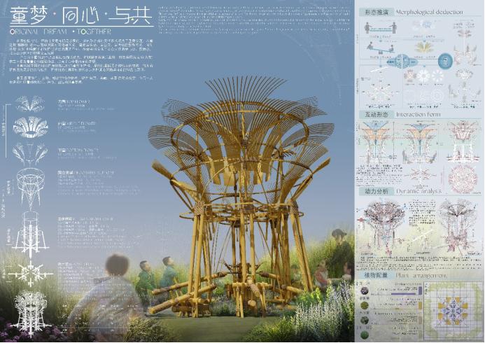 设计理念:在后疫情时代,保持社交距离仍是必要的,如何融合新的交往形式成了重要议题。本案创意来源自“跷跷板”这一最简单的面对面沟通形式,同时选择“花火”,也唤醒了那颗憧憬梦想的真切童心。一个由竹构打造的快乐交往圣地,应时而生。竹构强调“参与、互动、融合”的合作体验,增强公众交往的参与性、团结力和获得感,呼应“共筑、共享、共融”的公园城市理念,向每一位市民传递那份令人兴奋、欢乐、纯真的梦想源动力。
