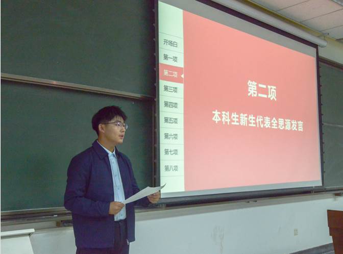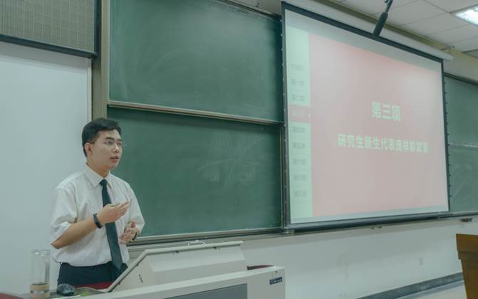 在接下来的研究生新生代表发言环节中,23级硕士新生庞祥毅同学从以下两个角度表达了自己对当下生活的反思。一方面,要反思我们个人的、具体的当下处境。在认识你自己的基础上做出恰当的选择;另一方面,要反思我们的人生追求,人生理想,人生价值。他从哲思智慧的视角出发,对树立自己的人生追求,坚定自己的人生理想,为“我们究竟该怎样度过这一生?”给出了自己孜孜探求的答案。