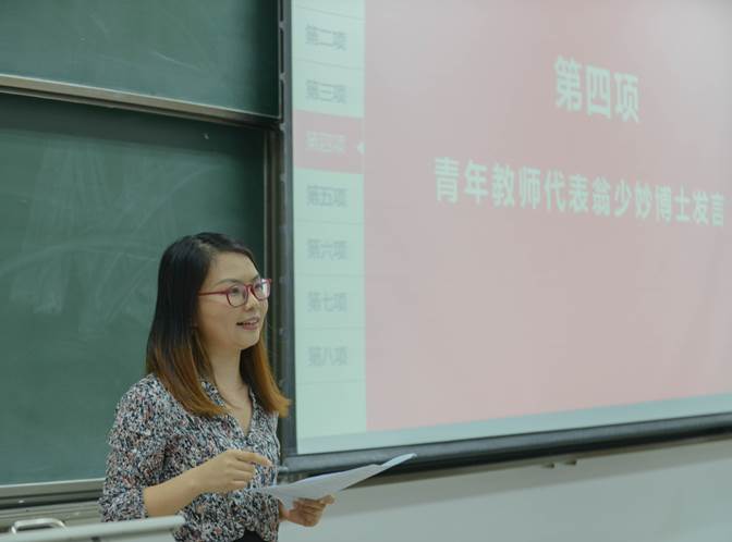 来自德国哲学教研团队的翁少妙博士作为青年教师发言。她首先回顾了自己的求学治学经历,表达了作为哲学教师的感慨和荣幸。她引导同学们要运用哲学视野的整体性与超越性,治疗当代科学发展的弊病,帮助我们安顿身心,寻找我们的精神故乡;她提出保留对于超越性价值的实践关怀、实践层面保有传统的形而上的追求是我们在当今充斥着功利主义和浮躁的社会自处的方式。翁老师在发言中对于哲学精句随手拈来,趣意横生,引得全体师生阵阵掌声。