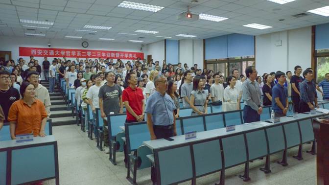 典礼的第五项是由哲学学科带头人、哲学系系主任马文保教授讲话,他首先隆重地对2023级新生表示热烈的欢迎和诚挚的祝贺,随后恳切地从历史、当下、未来三个角度全面深入地把哲学系介绍给全体新生。马主任回顾了建系初期,前辈们艰辛创业,不畏困难的过往,传递了前辈们听党指挥跟党走、毅然决然的西迁精神,表达了当代哲学人昂首挺胸的底气。师生们从哲学系源远流长的历史中感受到了前辈们创业的艰辛,将哲学系从无到有建设起来的辛苦与坚持,被西迁精神中听党指挥、跟党走,响应国家号召的家国情怀所鼓舞。为哲学系立足自身特色、不断与其他学科交叉融合,一步步走向成熟壮大所振奋。在哲学系多次孵化出其他学科、为交大文科发展作出贡献的故事中深感自豪。前人坚持不懈的努力成就了今天拥有哲学一级博士学位授权点,博士后流动站的等众多成就,同时也让哲学系的师生人数逐年上升,成长为今天的哲学系大家庭。今天哲学系的辉煌不仅是全体师生自豪的底气,更是鼓励我们不断前进的动力。最后,马主任向全体师生提出了殷切的希望:我们这一批西交哲学人应当继往开来,砥砺前行,再创哲学系的辉煌。