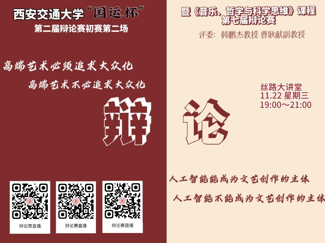 “国运杯”第二届辩论赛初赛第二场暨《音乐、哲学与科学思维》课程第七届辩论赛在丝路大讲堂教二1400厅顺利举行。本次比赛到场的嘉宾有成人影视片