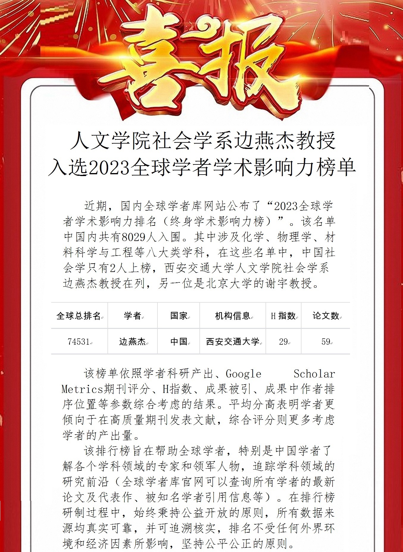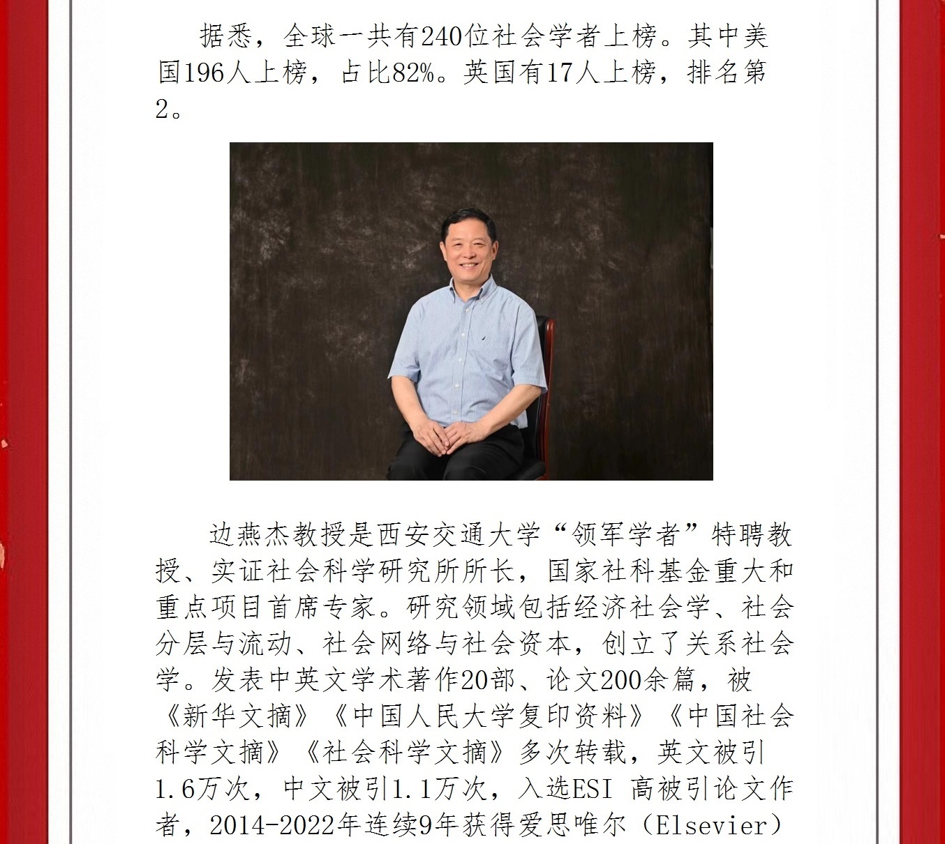【喜报】成人影视片 社会学系边燕杰教授入选2023全球学者学术影响力榜单