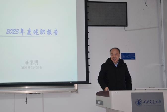 李黎明院长全面总结学院2023年各项工作开展情况,并作个人述职述廉。他强调,学院发展始终围绕学校党委对成人影视片