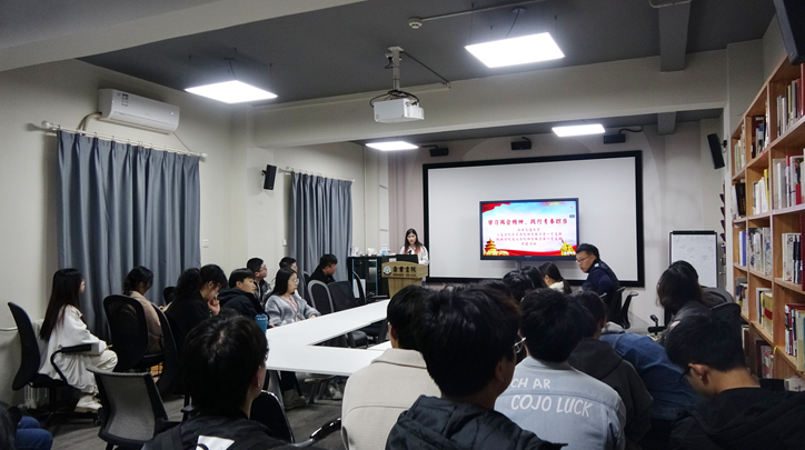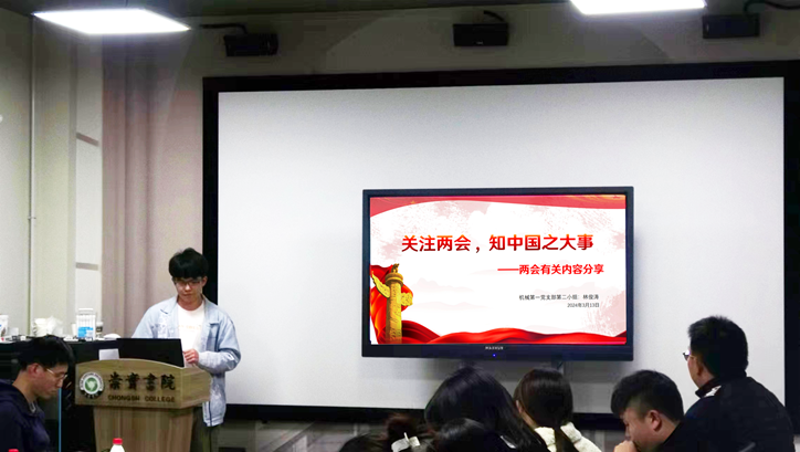 机械学院文治书院师生联合第一党支部的林俊涛同学为同学们介绍了“两会”的由来及相关重要知识,同时分享了医疗医保、婚育政策、养老政策等热门“两会”提案,鼓励同学们作为中共党员要多关心天下事,多参与到国家热点问题建设中去,将自己的学科知识与国家热点问题相连接,为人民福祉贡献力量。