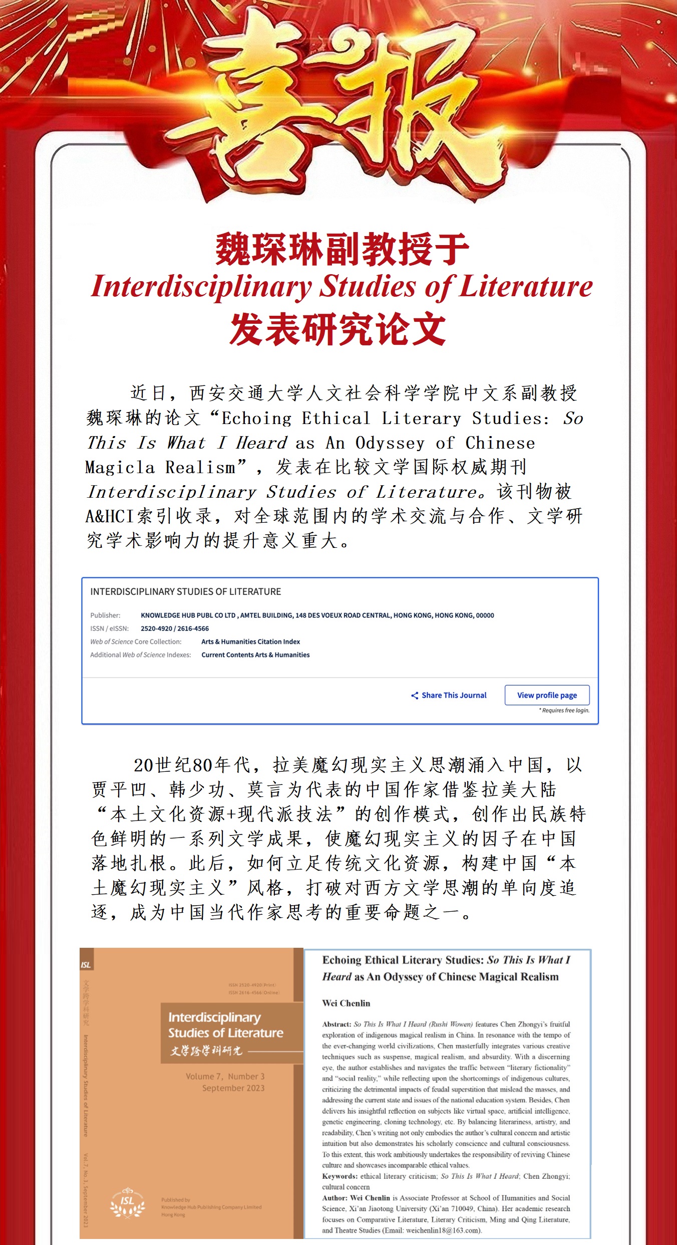 喜报 魏琛琳副教授于Interdisciplinary Studies of Literature发表研究论文
