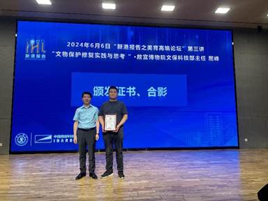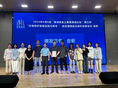 此次高端论坛收获了广大师生与校外听众的热烈反响,师生们纷纷表示对文物的保护和修复有了更为全面而深刻的了解与认识。论坛进入尾声,张勇副院长代表学校向屈峰主任颁发纪念证书,并与论坛嘉宾一同合影留念。