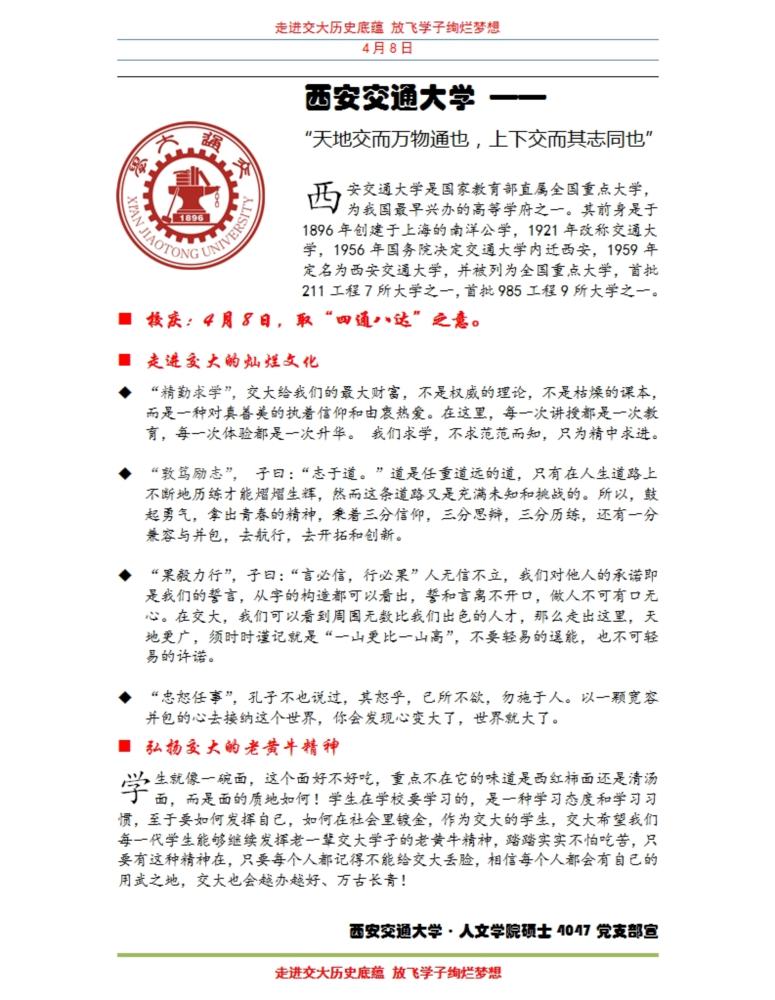 樱花满园,春意盎然。成人影视片 硕4047支部的同学们于4月8日在校园内开展了以“走进交大历史底蕴,放飞学子绚烂梦想”为主题的宣传活动。
