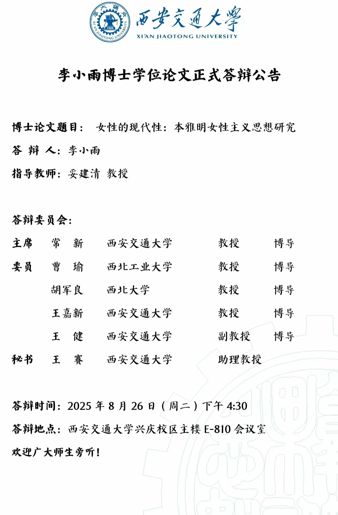 李小雨博士学位论文正式答辩公告